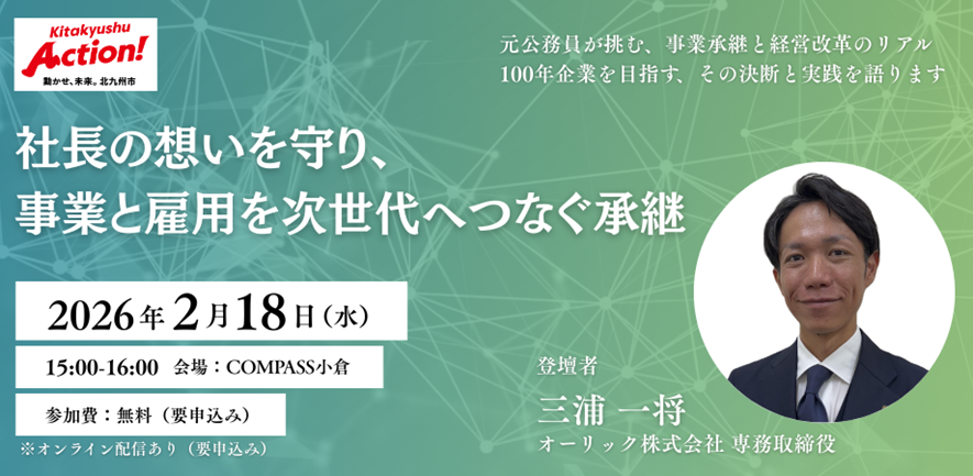 この度、“新しい事業承継の選択肢”として注目が高まるサーチファンドをテーマに、北九州市との共催によるセミナー